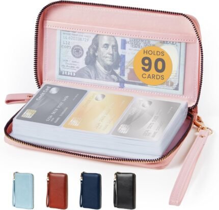 Sooez Safe Zipper Business Card Holder Organizer Book, 180 Capacity Credit Card Holder Wallet, Premium Vegan Leather Gift Card Holder Organizer, RFID Credit Card Holders for Men & Women, Pink