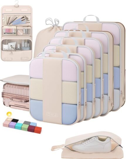 OlarHike 10 Set Compression Packing Cubes for Travel Women Mom,Luggage Clothes Storage Gifts for Travelers,Airplane/Cruise/Car/Train Travel Essentials,Compressible Expandable Saver Space Bags(Beige)