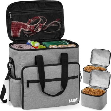 Dog Travel Bag with Treat Pouch, Airline Approved Dog Bags for Traveling, 2 Dog Food Travel Container, 2 Travel Bowls, Weekend Dog Travel Bag for Supplies, Dog Travel Kit Accessories