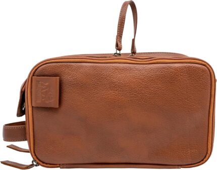 Leather Toiletry Bag for Men & Women – Travel Organizer Shaving Dopp Kit with Multiple Compartments & Hook for Easy Access – Water-Resistant Brown 11.5x7x3 Cosmetics Bag