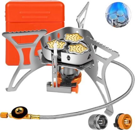 6800W Portable Windproof Camping Stove – Foldable Backpacking Stove with Piezo Ignition, Fuel Canister Adapter & Carry Case for Outdoor Cooking, Hiking & Picnics