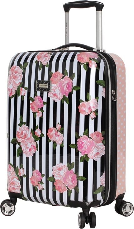 Betsey Johnson Designer 20 Inch Carry On – Expandable (ABS + PC) Hardside Luggage – Lightweight Durable Suitcase With 8-Rolling Spinner Wheels for Women (Stripe Roses)
