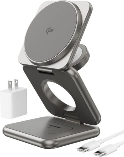 Qi2 Certified 15W Magnetic Foldable Charger, KU XIU X40Q 3 in 1 Wireless Charging Station for Apple, Aluminum Alloy Travel Charger Stand for iPhone 16/15, 5W for Apple Watch, AirPods, Natural Titanium