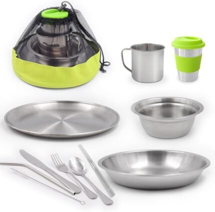 10-Piece Camping Mess Kit, Stainless Steel Camping Dishes Set Dinnerware for 1-2 Person Utensils Tableware with Cups, Plates, Bowl, Cutlery, Mesh Bag for Backpacking Hiking Picnic RV Travel