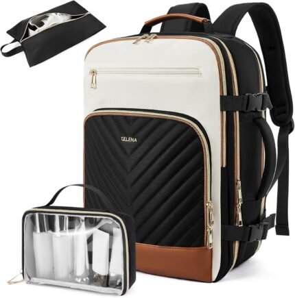 Telena Travel Backpack for Women, 15.6 inch Laptop TSA Carry On Personal Item Size Flight Approved Travel Bag Daypack with Multi-Pockets for Work, Travel, Business, Black-Beige-Brown