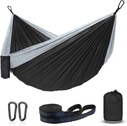 Hammock Camping, Portable Single/Double Hammocks for Outdoor Hiking Travel Backpacking – 210D Nylon Hammock Swing for Backyard & Garden (Black/Gray)