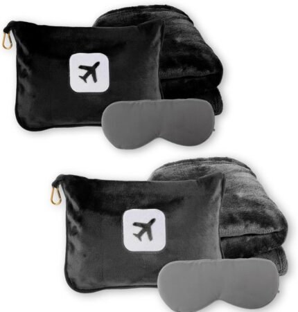 2 Pack Portable Travel Blanket and Pillow – Premium Soft 2 in 1 Airplane Blanket with Compact Pack Soft Bag Pillowcase, Hand Luggage Sleeve and Backpack Clip (Gray+Black)