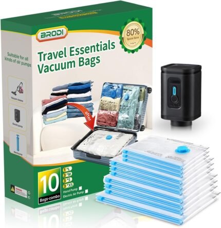 BRODI 10 Combo Pack Travel Vacuum Bags with Pump – Compression Bags for Travel,Vacuum Storage Bags for Space Saver & Travel Essentials,Vacuum Seal Bags for Clothing,Travel Vacuum Bags for Luggage