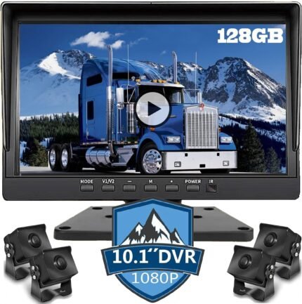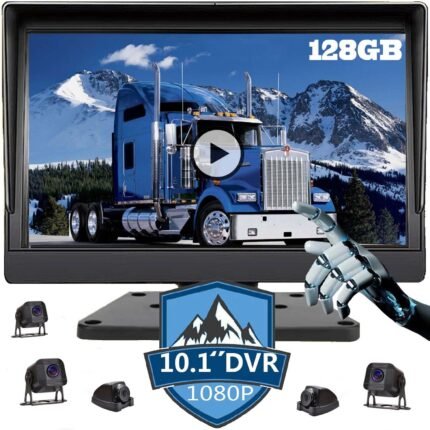 128GB 10.1″ Audio Monitor Backup Camera Built-in DVR Dash Cam for RV Truck Trailer Rear Side Front Backing View Wired System 1080P HD Image 4 Split Screen IP69 Waterproof Avoid Blind Spot A10