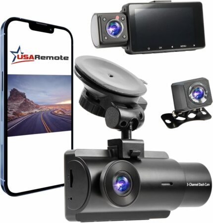 USARemote 3Channel Dash Cam WDR 1440P+1080P Front and Rear Inside 3 Inch Screen, G Sensor Motion Detection and Loop Recording, Reverse Car Camera Dashcam, GPS Suction Mount, USB Type C for Cars