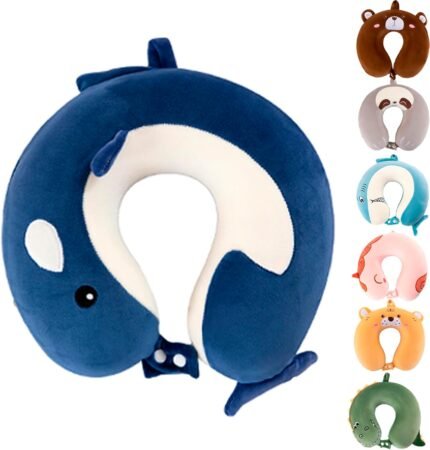 Kids Neck Pillow for Traveling, Upgraded Cartoon Cute Travel Neck Pillow for Kids Boys & Girls, Airplane Memory Foam Travel Pillow for Flight Headrest Sleep, Portable Plane Accessories (Dolphin)