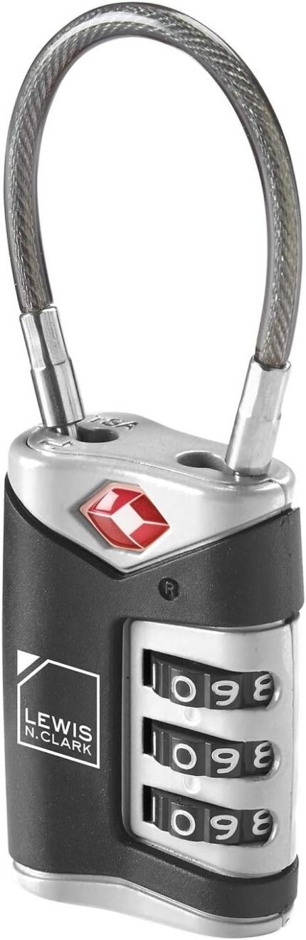 Lewis N. Clark TSA Approved Luggage Lock + Steel Cable for Suitcase, Carry On, BackPack, Laptop Bag + Purse, Perfect For Airport, Hotel or Gym – Set + Reset Your Own Combo, Black