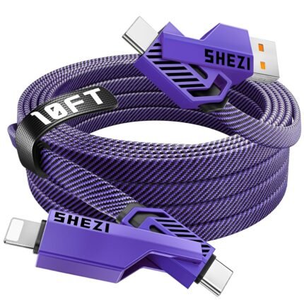 SHEZI [Upgraded 2.0] 4-in-1 USB C Cable 60W 10FT Fast Charging [480Mbps Data Sync] Flat Nylon Braided Charger Cord Combo, USB A/C to C/L Multi Charge Cable for iPhone/iPad & Most Devices, Purple