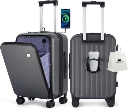BISON DENIM 20 Inch Carry On Luggage, PC Lightweight Hardside Expandable Carry-On Luggage Airline Approved With Spinner Wheels, Front Compartment, Cup Holde, TSA-approved Lock, USB Port, Dark Grey