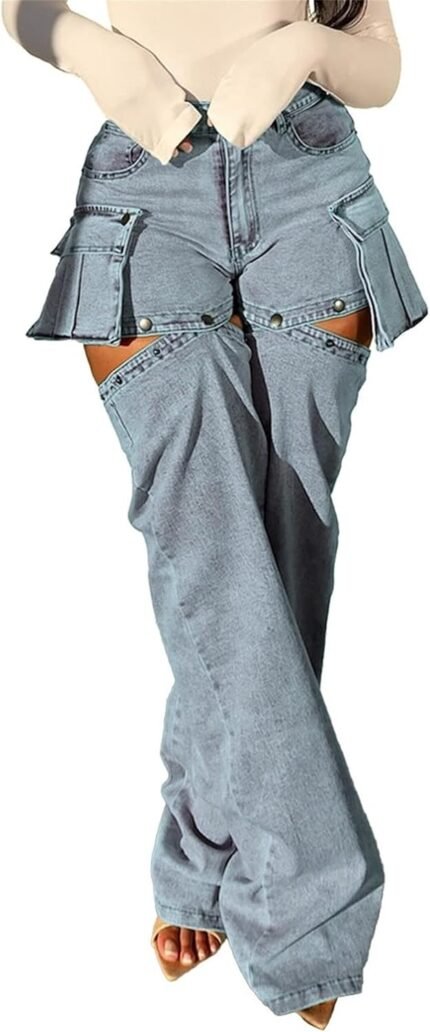 Cargo Jeans for Women High Waisted Baggy Convertible Jeans Y2K Straight Leg Detachable Jean Shorts Streetwear