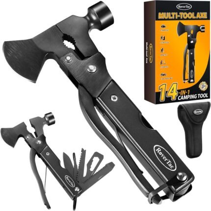 RoverTac 14-in-1 Multitool Camping Axe – Multi Tool with Knife, Hammer, Saw, Screwdrivers, Bottle Opener – Camping Tool with Sheath – Tool Gifts for Men, Dad, Husband, and Outdoor Enthusiasts.