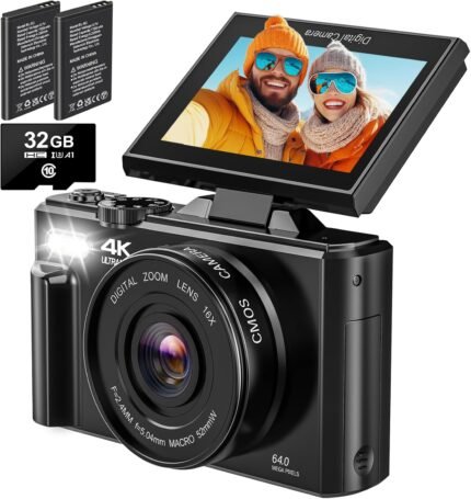 4K Digital Camera for Photography – 64MP Vlogging Camera for YouTube – Auto-Focus 4K Video Camera with 18X Zoom – 3″ 180° Flip Screen Compact Travel Camera with 32GB SD Card, 2 Batteries