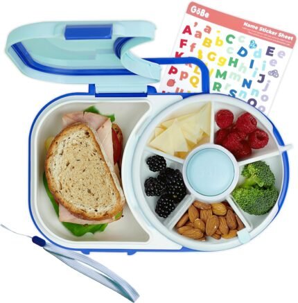 GoBe Kids Lunchbox with Small Snack Spinner Flip – Bundle with Hand Strap & Sticker Sheet, 2-in-1 Bento Style Lunch Container, 5 Small +1 Large Sandwich Compartment, BPA & PVC Free- Macaron Blue