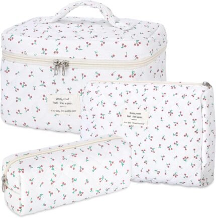 senbowe Floral Makeup Bag, 3 Pack Large Cotton Quilted Makeup Bag Set, Cute Floral Coquette Aesthetic Toiletry Bag Make Up Cosmetic Bag for Women, Toiletry Travel Make Up Organizer Bag