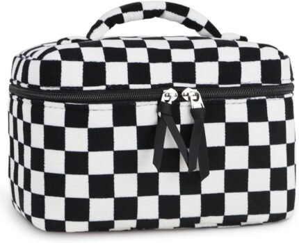 Prite Corduroy Large Travel Quilted Makeup Bag for Women Floral Cotton Cosmetic Bag Coquette Aesthetic Floral Toiletry Organizer Bag(Dark Checkerboard)