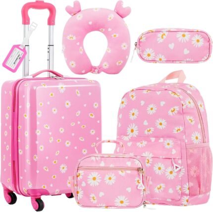 Redbaker 6 Pcs Kids Luggage Set 17 Inch Kids Rolling Luggage Double Pattern Suitcase for Girls Boys Gift(Pink,Daisy Style)