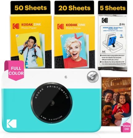 KODAK Printomatic Full-Color Instant Print Digital Camera – 75 Sheets Bundle – Prints On Zink 2×3 Sticky-Back Photo Paper – 5MP, Portable, Creative Fun Gift for Birthday, Christmas, Holiday – Blue