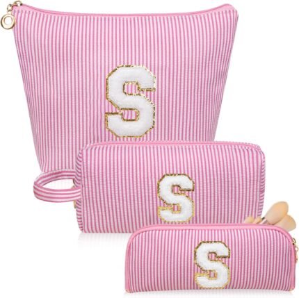 Initials Makeup Bag Set, Personalized Pink Cosmetic Bag, Cute Large Make up Bags, Travel Toiletry Bag for Women Girl Gifts S (Pink)