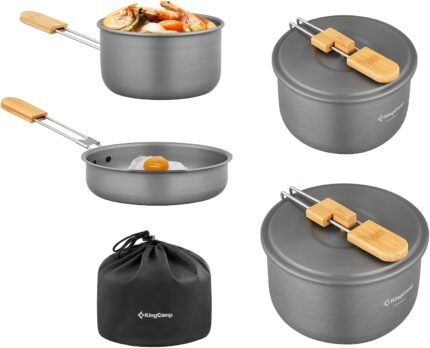KingCamp 7pcs Camping Cookware Mess Kit Aluminum Folding Camping Pots and Pans Set with Bamboo Handle Lightweight Backpacking Cooking Set Outdoor Cook Gear for Family Hiking Picnic
