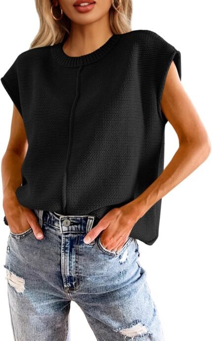 Saodimallsu Womens Summer Cap Sleeve Tops Casual Crew Neck Loose Fit Knit Lightweight Sweater Pullover Top