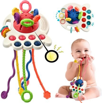 AiTuiTui Sensory Montessori Baby Teething Toys, Toddler Travel Toys for 1 2 Year Old Boy Girl Birthday Gifts, Soft Pull String Fidget Educational Learning Toys for 9 10 18 Months Infant, Random Color