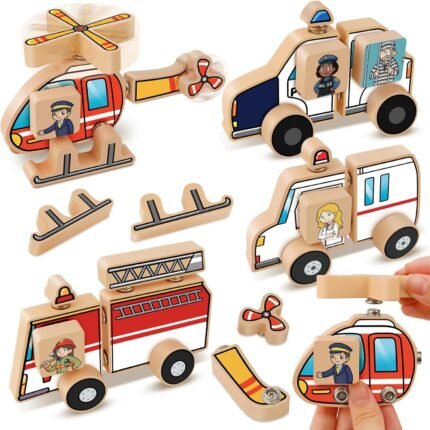 Aizweb Emergency Vehicle Toys,Wooden Police Car, Fire Truck, Ambulance, Helicopter,STEM Kit Fine Motor Blocks Educational Learning Montessori for 4-8 Year Old Boys Girls Community Helper