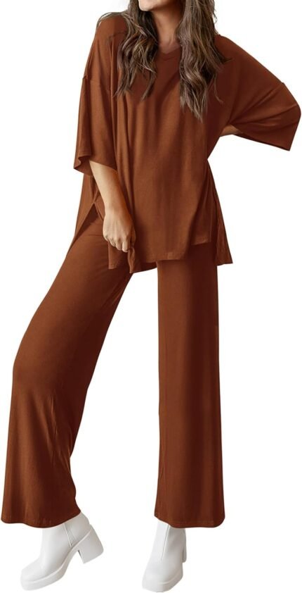 MASCOMODA Womens Summer 2 Piece Outfits Short Sleeve V Neck Tops Wide Leg Long Pants Casual Tracksuit Lounge Set