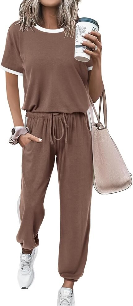 MASCOMODA Womens 2 Piece Outfits 2025 Summer Tracksuit Sets Short Sleeve Tops Travel Long Pants Jogger Lounge Set