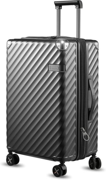 LUGGEX Luggage with Spinner Wheels, Polycarbonate Expandable Hard Shell Suitcase, Checked Medium 24 Inch, Charcoal Metallic