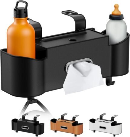 3-in-1 Car Organizers and Storage Box, Multifunctional Car Seat Back Storage Box with Tissue Holder, 2 Cup Holders & Purse Hooks, Back Seat Car Organizer for Kids and Travel (Black)