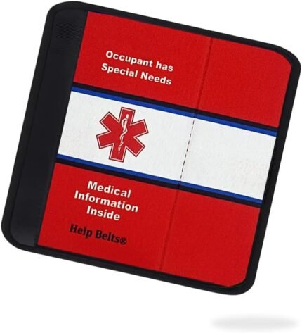 General Any Condition Medical Alert Child Car Seat Belt Cover (6”) with Pocket for Emergency Information and Contacts Form Complete Online or by Hand. Made by Help Belts. (Red/White)