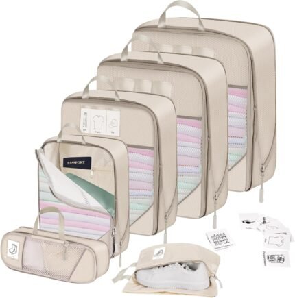 Price: (as of – Details) Compression Packing Cubes for Suitcases, 6 Set Travel Luggage Organizer Bags Lightweight Waterproof Smell Proof