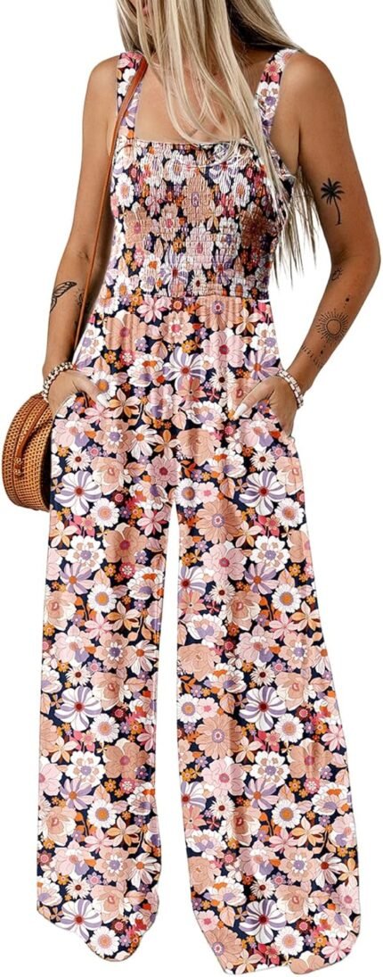 Dokotoo Women’s Casual Loose Overalls Jumpsuits One Piece Sleeveless Printed Wide Leg Long Pant Rompers With Pockets