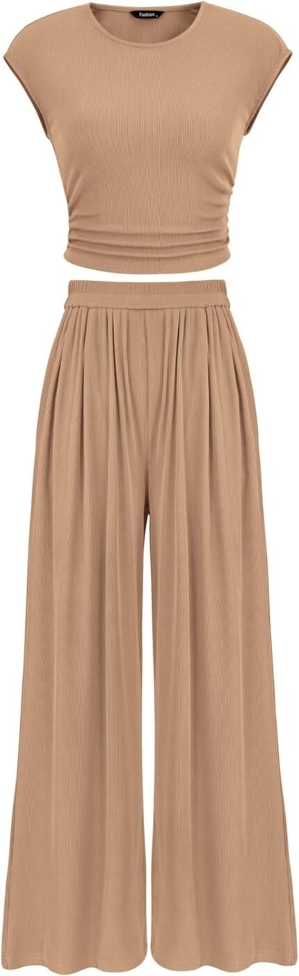 PRETTYGARDEN Women’s Summer 2 Piece Outfits 2025 Cap Sleeve Ruched Slim T Shirt Ribbed Knit Wide Leg Pant Sets Tracksuit