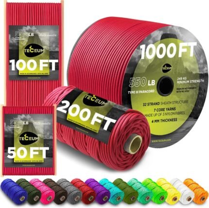 TECEUM Paracord Type III 550 Crimson – 200 ft – 4mm – Tactical Rope MIL-SPEC – Outdoor para Cord –Camping Hiking Fishing Gear and Equipment – EDC Parachute Cord – Strong Survival Rope 324
