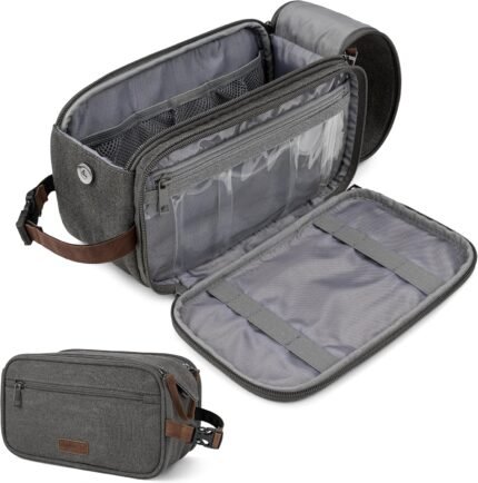 PAVILIA Toiletry Bag for Men Women, Canvas Travel Dopp Kit, Water Resistant Hygiene Bag Toiletries Organizer, Shaving Kit Travel Accessories Bag, Grey