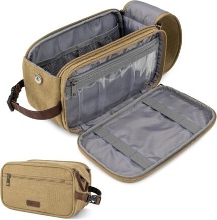PAVILIA Toiletry Bag for Men, Canvas Travel Dopp Kit, Water Resistant Hygiene Bag Toiletries Organizer, Shaving Kit Travel Accessories Bag, Tan Khaki