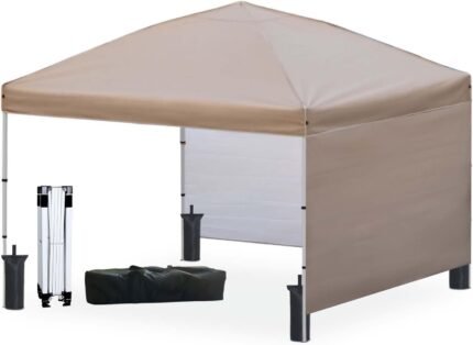 10×10 Pop Up Canopy Tent with 2 Sidewalls, Waterproof Shade Canopy with Sand Bags Outdoor Canopy Tent for Camping Beach Parties Backyard (Khaki)