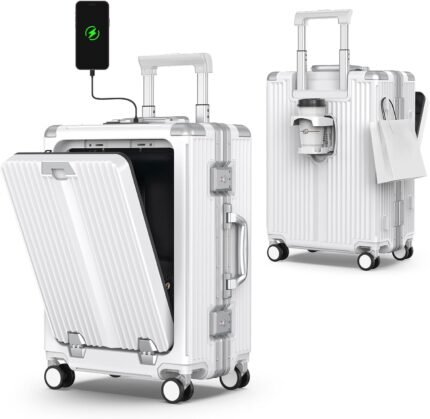 Portable Carry on Luggage Airline Approved, Expandable Luggage with Cup Holder for Trips, Practical Suitcase with Front Pocket & USB Port.(WHITE-01)