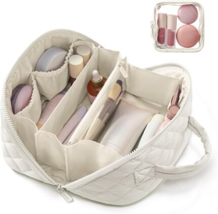 LOVEVOOK Travel Makeup Bag for Women, 2Pcs Set Puffer Waterproof Cosmetic Organizer, Large Capacity Pouch Open Flat Toiletry Bag with Divider & Handle, Portable Gift for Her, Beige