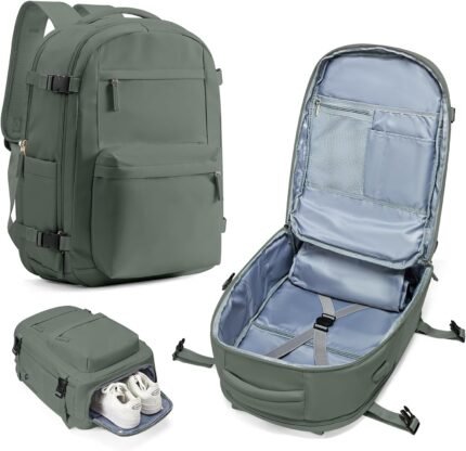 Large Travel Backpack For Women Men,Mochila de Viaje,Carry On Backpack with USB Charging Port & Shoe Pouch,Airline Approved Personal Item Travel Bag,Waterproof Luggage Backpack(Green)
