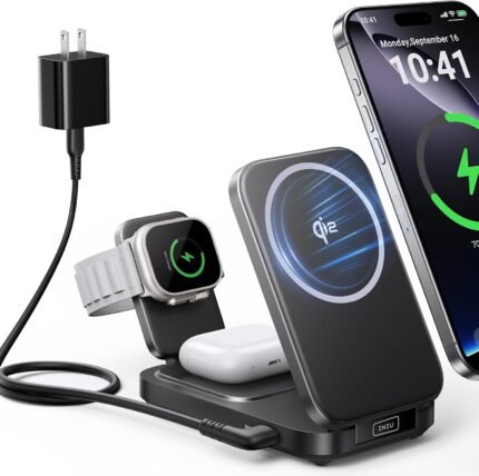 INIU 3 in 1 Wireless Charging Station, Qi2 Certified Mag Safe Travel Charger for Apple Multiple Devices, Foldable Charger Stand for Apple iPhone 16 15 14 13 12 Series Watch AirPods (with Adapter)