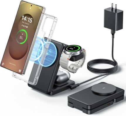3 in 1 Magnetic Foldable Wireless Charger for Samsung, Fast Mag-Safe Charging Stand Station for Galaxy S25 S24 S23 S22 Ultra Plus/Z Fold/Flip 6/5, Galaxy Watch Ultra/6/5/Pro, Galaxy Buds/Pro