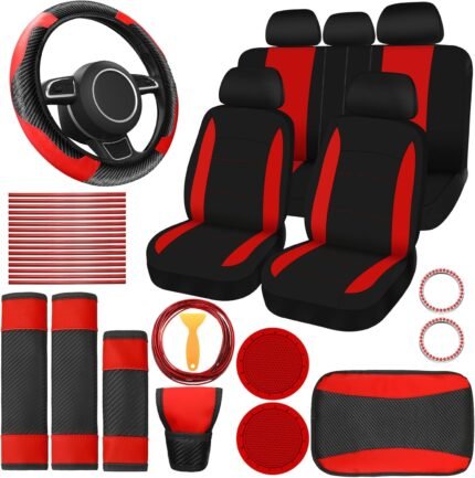 Estune 41 Pcs Black Red Car Accessories Set Automotive Seat Covers Steering Wheel Cover Seat Belt Pad Shift Sleeve Start Button Rings Armrest Cup Holders Vent Outlet Trim Scraper for Auto Interior