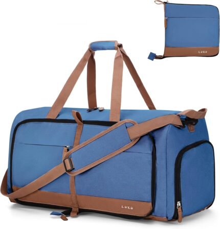Lekesky Foldable Travel Duffle Bag for Women, 60L Large Duffel Bag with Separate Shoes Compartments & Straps, Carry On Weekend Bag for Women, Hospital, Overnight (Blue Stripes)
